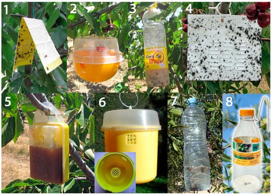 - Katsoyannos, B.I.; Papadopoulos, N.T.; Stavridis, D. Evaluation of trap types and food attractants for Rhagoletis cerasi (Diptera: Tephritidae). J. Econ. Entomol. 2000, 93, 1005–1010. [Google Scholar] [CrossRef]