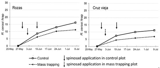| Barrachina | La Almunia (Zaragoza) (41°27′07″ N 1°23′59″ W) 455 m a.s.l. | 2021 (13/05–18/06) | Folded yellow sticky trap + Econex Rhagoletis cerasi 90 days | 106 (0.4 ha) |