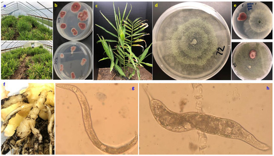 (a) front (top) and back (bottom) view of a high tunnel with pockets of affected areas, a typical spatial pattern of seed and diseases (SSDs); (b,c) isolation of Fusarium oxysporum f.sp. zingiberi and yellowing symptom after artificial inouculation; (d,e) Trichoderma harziahum strain T-22 and dual cultures on potato dextrose agar (PDA) showing the interactions 3 days (top) and 9 days (bottom) after inoculation at 30 °C; (f) root knot symptom on ginger; (g,h) adult and female Meloidogyne incognita.