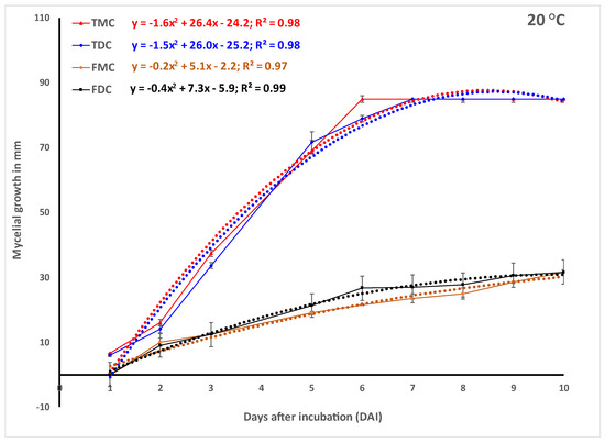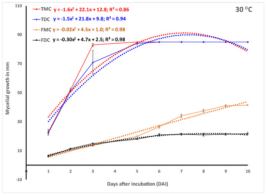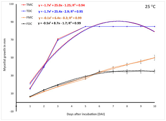 In vitro mycelial growth of the pathogen causing yellowing and rhizome rot of ginger Fusarium oxysporum f.sp. zingiberi and the beneficial fungus Trichoderma harzianum strain T-22 in monocultures (FMC, TMC) or dual cultures (FDC, TDC) on potato dextrose agar (PDA) medium incubated at 20, 25 and 30 °C. The continuous lines are the actual data points and the dotted lines represent predicted data according to a second-degree polynomial function.