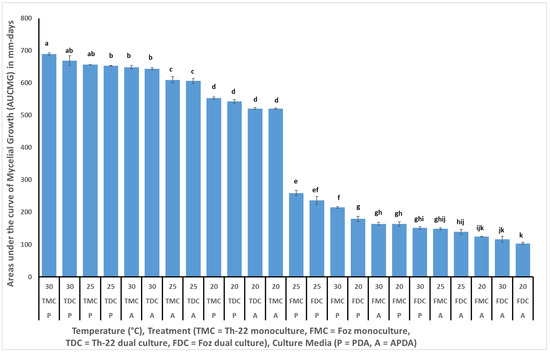 Treatment means for the AUMGC separated using Tukey’s test at p < 0.05 level is presented in Figure 3. The trichoderma strain in this study Th-22 grew significantly faster in monoculture and in dual culture than Foz when incubated at 30 or 25 °C in both PDA and APDA (Figure 3). The growth of Th-22, however, was significantly lower when incubated at 20 °C irrespective of the culture media. In contrast, Foz grew significantly lower at all levels of temperature and culture medium and the four treatment combinations when compared with the growth of Th-22 (Figure 3). At 30 °C, percent inhibition of growth 10 days after incubation on Foz was 47.8% and 40.2% on PDA and APDA, respectively (data not presented).