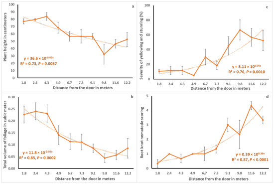 Spatially, growth parameters in terms of plant height (cm) and total volume of foliage (cubic meters) showed decrement as one walked from the front door towards the back end of the rows (Figure 4). For instance, average plant height (mean ± SE) within 0.6 m of the door was 77.0 ± 3.5 cm compared to only 52.5 ± 9.8 cm at 12.2 m distance from the door (Figure 4a). The trend was fitted well to and described by the exponential decay function with coefficient of determination values of 0.73 (p = 0.0037) and 0.85 (p = 0.0002), respectively. On the other hand, disease parameters in terms of severity of yellowness and stuntedness (%) and root knot nematode scoring (0–5 scale) increased as one walked from the front door to the back of the HT. Average percent disease severity (mean ± SE) within 0.6 m of the door was 10.7 ± 2.4 % compared to 52.3 ± 13.5 % at 12.2 m distance from the door (Figure 4c).