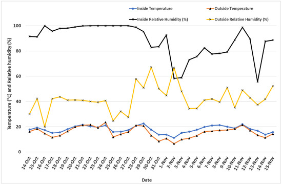 Contrast of temperature (°C) and relative humidity (%) inside and outside the high tunnel (HT) where the trial was conducted. A TinyTag® data logger was placed at ground level in the middle of the HT and another one placed on a raised bed outside the HT where ginger plants were grown.