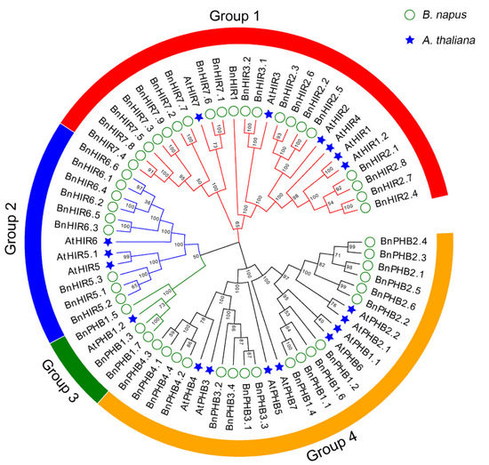Phylogenetic relationship of HIR proteins between A. thaliana and B. napus. The ML tree was generated with bootstrap analysis (100 replicates) using the online PhyML server. The tree was visualized by Evolview V3. HIR proteins in the phylogenetic tree clustered into four groups (Groups 1–4). At: A. thaliana; Bn: B. napus.