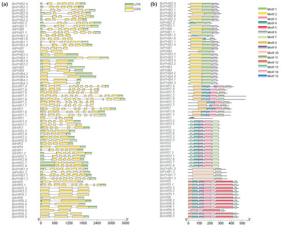 To analyze the exon/intron structure of the BnHIR and AtHIR genes, we compared the CDS with their corresponding genomic sequences. The results showed that most BnHIR genes contained 3–6 exons, and some genes contained more than 8 exons, such as BnHIR7 subfamily genes (Figure 2a). Genes from the same subfamily presented similar gene structures. Most BnHIR genes have a long exon at the 3′ ends of their genomic sequence. Furthermore, the gene structure of BnHIR is highly similar to their corresponding AtHIR.