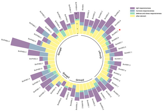Cis-acting elements in the promoter region of BnHIR genes. Cis-acting elements in promoter regions were predicted using PlantCARE (http://bioinformatics.psb.ugent.be/webtools/plantcare/html/, accessed on 17 March 2022) and plotted using R package tidyverse. All cis-acting elements are grouped into four categories and marked with different colored boxes. The red star represents the target gene for subsequent functional verification.