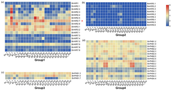 Expression patterns of BnHIR genes in different tissues. (a) Expression patterns of HIR genes in Group 1. (b) Expression patterns of HIR genes in Group 2. (c) Expression patterns of HIR genes in Group 3. (d) Expression patterns of HIR genes in Group 4. The blue-to-red color bar on the right represents log2-transformed expression values, with blue indicating little or no expression and red indicating high expression. Expression data were obtained from the BrassicaEDB database (https://biodb.swu.edu.cn/brassica/, accessed on 13 February 2022), and expression levels of BnHIRs were normalized by log2(FPKM + 1). Complete tissue names are listed in Materials and Methods. The red star represents the target gene for subsequent functional verification.