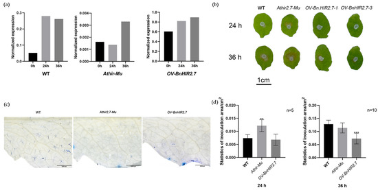 The expression levels of SA and MeJA pathway marker genes of Col-0, Athir2.7-Mu, and OV-BnHIR2.7 plants were detected at different times after inoculation with S. sclerotiorum (Figure S3a). We analyzed the phenotypes of OV-BnHIR2.7 transgenic A. thaliana overexpression lines, Athir2.7-Mu mutants, and wild-type Col-0 plants. At the seedling stage, there was no noticeable difference between Col-0 wild-type, OV-BnHIR2.7, and Athir2.7-Mu (Figure S3b). At the maturity stage, OV-BnHIR2.7 plants were prominently higher than Athir2.7-Mu plants (Figure S3c). In addition, the siliques of the Col-0 wild-type were prominently smaller than those of the OV-BnHIR2.7 plants but prominently longer than those of the Athir2.7-Mu (Figure S3d). These results suggest that HIR2.7 is a critical positive regulator of plant growth and development, especially in promoting silique length. Moreover, there was no extreme difference in BnHIR2.7 expression in the overexpressed lines before and after S. nucleobium inoculation (Figure 6a). Notably, trypan blue staining showed that overexpression of BnHIR2.7 in A. thaliana did not induce programmed cell death (Figure 6b). Col-0, Athir2.7-Mu, and OV-BnHIR2.7 A. thaliana leaves showed different degrees of lesions at 24 h and 36 h after inoculation with S. sclerotiorum (Figure 6c). At 48 h after S. sclerotiorum inoculation, the lesions expanded to the entire A. thaliana leaf (Figure S3e). Correspondingly, the infected area of strain in overexpressed lines was significantly (p = 0.00007) lower than that of Col-0 at 36 h inoculated, and that of Athir2.7-Mu was significantly (p = 0.0036) higher than that of Col-0 at 24 h inoculated (Figure 6d).