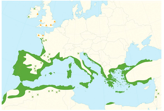- Caudullo, G.; Welk, E.; San-Miguel-Ayanz, J. Chorological maps for the main European woody species. Data Brief 2017, 12, 662–666. [Google Scholar] [CrossRef]