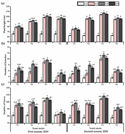 Plant height (cm) (a), number of branches (b), and number of leaves (c) of Plectranthus amboinicus (Lour.) Spreng. plants subjected to Rhodotorula muciligenese (Y1), Candida sake (Y2), Candida apicola (Y3), and Candida kunwiensis (Y4) yeast strains foliar application at 0 (C1), 1 × 104 (C2), 1 × 107 (C3), and 1 × 109 (C4) CFU mL–1 concentrations during 2019 and 2020 seasons. Data are mean value ± SE. Means with different letters for each season significantly differed, using Tukey’s test at p ≤ 0.05 level, n = 15.