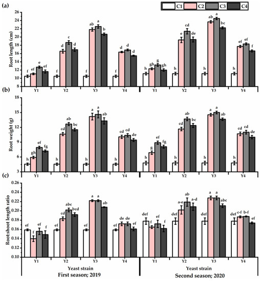 Root length (cm) (a), root weight (g) (b), and root:shoot length ratio (c) of Plectranthus amboinicus (Lour.) Spreng. plants subjected to Rhodotorula muciligenese (Y1), Candida sake (Y2), Candida apicola (Y3), and Candida kunwiensis (Y4) yeast strains foliar application at 0 (C1), 1 × 104 (C2), 1 × 107 (C3), and 1 × 109 (C4) CFU mL–1 concentrations during 2019 and 2020 seasons. Data are mean value ± SE. Means with different letters for each season significantly differed, using Tukey’s test at p ≤ 0.05 level, n = 15.
