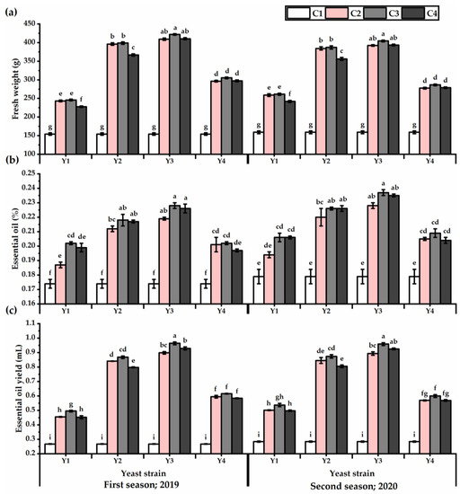 The herb fresh weight values exhibited in Figure 3 showed an improvement as affected by yeast treatments (Table S3), and Y3 outperformed the other strains in this respect (349 and 337.3 g for the first and second seasons, respectively). Treated plants with Y3 × C3 exhibited the heaviest weights, as recorded 342.9 and 334.7 g for the first and second seasons, respectively, while untreated plants presented the lowest values in this respect. Essential oil percent and yield traits showed an increase, as influenced by yeast applications, and Y3 exhibited the highest values in this respect. Plants subjected to foliar application with Y3 × C3 presented an improvement in the essential oil yield of 72.2 and 70% relative to untreated plants for the first and second seasons, respectively. The Y1 × C4 treatment significantly showed the lowest essential oil yield after untreated plants, despite achieving an increase in the essential oil yield of about 41 and 43% for the first and second seasons, respectively, relative to untreated plants.