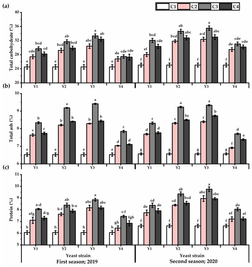 Total carbohydrates (%) (a), ash (%) (b), and protein (%) (c) of Plectranthus amboinicus (Lour.) Spreng. plants subjected to Rhodotorula muciligenese (Y1), Candida sake (Y2), Candida apicola (Y3), and Candida kunwiensis (Y4) yeast strains foliar application at 0 (C1), 1 × 104 (C2), 1 × 107 (C3), and 1 × 109 (C4) CFU mL−1 concentrations during 2019 and 2020 seasons. Data are mean value ± SE. Means with different letters for each season significantly differed, using Tukey’s test at p ≤ 0.05 level, n = 15.