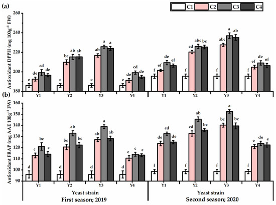 DPPH (mg 100 g−1) (a) and FRAP (mg AAE 100 g−1 FW) (b) of Plectranthus amboinicus (Lour.) Spreng. plants subjected to Rhodotorula muciligenese (Y1), Candida sake (Y2), Candida apicola (Y3), and Candida kunwiensis (Y4) yeast strains foliar application at 0 (C1), 1 × 104 (C2), 1 × 107 (C3), and 1 × 109 (C4) CFU mL−1 concentrations during 2019 and 2020 seasons. Data are mean value ± SE. Means with different letters for each season significantly differed, using Tukey’s test at p ≤ 0.05 level, n = 15.