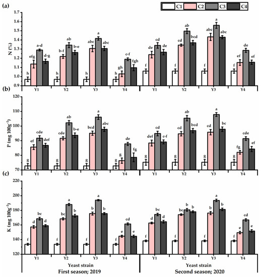 N (%) (a), P (mg 100 g−1) (b), and K (mg 100 g−1) (c) of Plectranthus amboinicus (Lour.) Spreng. plants subjected to Rhodotorula muciligenese (Y1), Candida sake (Y2), Candida apicola (Y3), and Candida kunwiensis (Y4) yeast strains foliar application at 0 (C1), 1 × 104 (C2), 1 × 107 (C3), and 1 × 109 (C4) CFU mL−1 concentrations during 2019 and 2020 seasons. Data are mean value ± SE. Means with different letters for each season significantly differed, using Tukey’s test at p ≤ 0.05 level, n = 15.