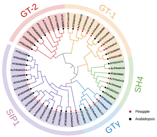 Since the 1990s, when the Trihelix family was first discovered in pea (Pisum sativum), more species have been discovered in this family [1,2,32,33,34,35]. However, information about pineapple Trihelix genes is scarce and needs further exploration. In this study, 23 Trihelix members from pineapple were identified. The numbers of Trihelix in pineapple (23) were lower than that of Arabidopsis (30), Oryza sativa (41), Lycopersicon esculentum (36), Brassica Rapa (52), Glycine max (63), Fagopyrum tataricum (31), Sorghum bicolor (40), Phyllostachys edulis (24), Dendrobium officinale (32), and Helianthus annuus (31) [1,2,5,32,33,34,35,36,37,38]. Moreover, the evolutionary relationship and classification of the Trihelix family were obviously different among various species. In Arabidopsis, 30 Trihelix members were identified and divided into 5 groups including GT-1, GT-2, GTγ, SH4, and SIP1 [39]. In Oryza sativa, 41 Trihelix members were also classified into 5 subfamilies, but GT-1 and GT-2 were combined into a GT clade, and the GTδ group was added [1]. Thirty-six Trihelix members of Solanum lycopersicum were classified into six groups, five of which were the same as Arabidopsis, and the GTδ group was added [34]. The Trihelix family classification of Helianthus annuus was the same as Solanum lycopersicum [35]. According to their phylogenetic relationships with Trihelix proteins from Arabidopsis and pineapple (Figure 1), these genes were divided into five subfamilies, and each subgroup contained at least one protein from pineapple and Arabidopsis.
