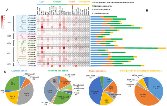 cis-element analysis of AcTrihelix promoters: (A) the cis-element analysis of Trihelix promoter region; (B) the numbers of different types of elements of AcTrihelix promoters were counted and are indicated by different colors; (C) the pie chart shows the proportion of each cis-element of the four types of response elements.