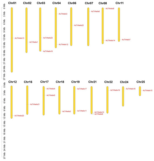 In addition, the exon-intron structure arrangements of the Trihelix family were analyzed. The information in Figure 2B is shown in Figure S1. The AcTrihelix family had 23 members, 4 members had no introns, and 19 members contained 1–16 introns, most of which belonged to AcTrihelix13. AcTrihelix3, AcTrihelix5, AcTrihelix13, and AcTrihelix18 had both 5′-UTR on N-terminus and 3′-UTR on C-terminus. AcTrihelix7, AcTrihelix10, AcTrihelix11, AcTrihelix21, and AcTrihelix23 had 3′-UTR on C-terminus, while AcTrihelix8 had 5′-UTR on N-terminus (Figure 2).