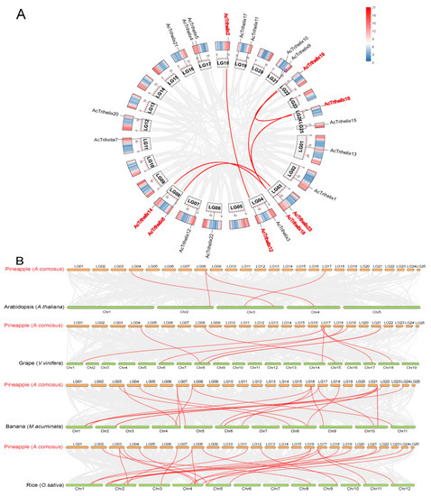 Duplication analysis and synlinearity analysis: (A) duplicate analysis of AcTrihelix gene in pineapple; (B) synteny analysis of AcTrihelix gene between pineapple and other plants (Arabidopsis and grape, rice and banana). The red line represents the homologous gene pairs.