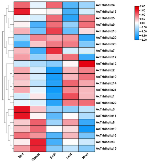 The expression of AcTrihelix genes in different floral organs. The red module represents high expression of tissues, and the blue module shows low expression. The patterns of expression were visualized with TBtools.