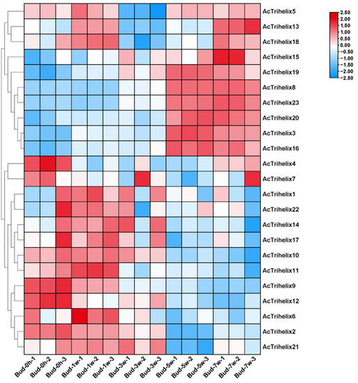 Expression profile of AcTrihelix genes in flower induction and flowering process. The labels Bud-0h, Bud-1w, Bud-5w, and Bud-7w on the X-axis represent the time (0 h, 1 week, 3 weeks, 5 weeks, and 7 weeks) after ethephon treatment. The number represents the three biological replicates of each sample. The Y-axis refers to the deduced FPKM value normalized with Log2.