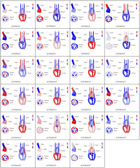 To further investigate the role of AcTrihelix in floral organ differentiation, the expression characteristics of AcTrihelix members in the different tissues of the flowering flowers were analyzed (Figure 8), and the original data are shown in Table S4. The expression levels of nine AcTrihelix members, including AcTrihelix1, AcTrihelix3, AcTrihelix7, AcTrihelix10, AcTrihelix11, AcTrihelix14, AcTrihelix17, AcTrihelix20, and AcTrihelix22, were significantly higher than the other parts in the ovary, and these members belonged to the SIP1 group except AcTrihelix7 and AcTrihelix11. Six AcTrihelix members, including AcTrihelix2, AcTrihelix6, AcTrihelix12, AcTrihelix13, AcTrihelix16, and AcTrihelix19, were obviously expressed higher in the sepal than in other tissues. In addition, seven members, i.e., AcTrihelix4, AcTrihelix5, AcTrihelix8, AcTrihelix9, AcTrihelix15, AcTrihelix18, and AcTrihelix23, had significant expressions in the stamen (Figure 8).