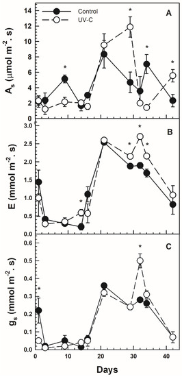Overall, net CO2 assimilation (As), transpiration (E) and stomatal conductance (gs) were not affected by UV-C irradiation (Table 1).