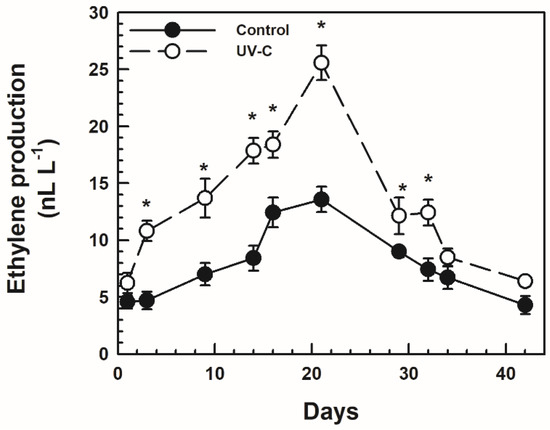 Ethylene production (nL L−1) of P. × hortorum stem cuttings irradiated with 1 kJ m−2 or left nonirradiated (controls) over a 6-week period. Data (n = 15) are means per treatment per day ±S.E. Asterisks indicate significant differences between treatment means at p = 0.05.