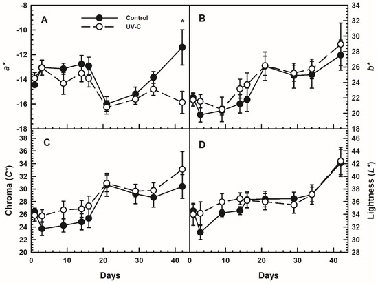 The colour attributes (a*, b*, C* and L*) of UV-C-treated stem cuttings were not different than those of the untreated controls (Table 1 and Figure 3). Both the treated and the untreated stem cuttings showed a moderate level of greenness with a* values ranging from −12.7 to −14.5 the first 21 d (Figure 3A). Then, the a* values increased up to −16.3 for the irradiated samples. The b* values expressing the yellowness of the samples remained positive for both the irradiated and the nonirradiated controls (Figure 3B). Yellowness increased from 21.5 at the beginning of the experiment to 28.9 at day 42. The chroma values (C*) increased slightly from 23.7 on day 3 to 33.1 on day 42 (Figure 3C).