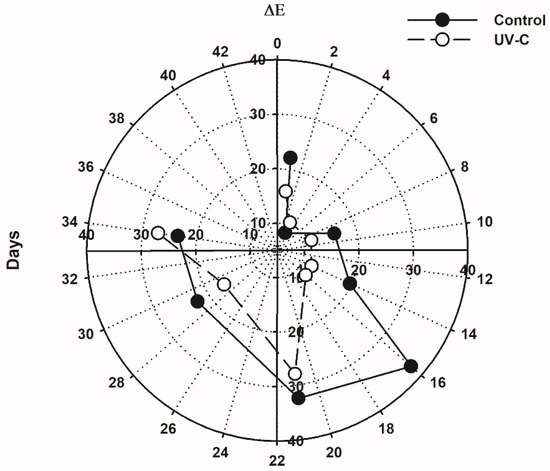 No differences in C* were recorded between the irradiated and the nonirradiated cuttings. Lightness (L*) increased throughout the 42-day evaluation period for both the UV-C-irradiated and the nonirradiated samples (Figure 3D). L* values ranged from 31.1 to 42.4, but no significant differences were detected between the UV-C-irradiated and the nonirradiated cuttings. The colour differences (ΔΕ) ranged considerably from the beginning to the end of the experiment (Figure 4). ΔΕ values were at 8.5 and 10.6 on day 3 and at 89.4 and 104.0 on day 42, for the control and the UV-C-treated cuttings, respectively. However, these differences were not significant at the p = 0.05 level.