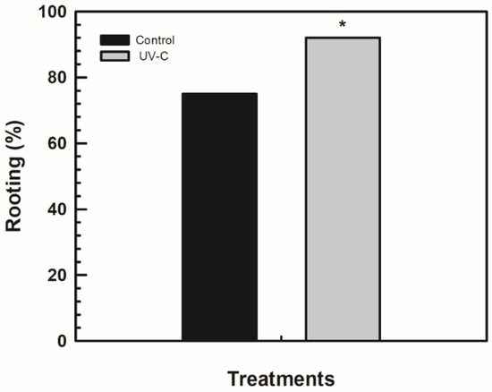 There is limited published research on the effects of UV-C irradiation on the growth and development of plant propagation material. Sukthavornthum et al. [20] showed that long exposures of Persian violet (Exacum affine Balf. f. ex Regel) plantlets grown in vitro to UV-C irradiation resulted in a reduced growth, but increased flower development. Phanomchai et al. [21] found that a single low-intensity UV-C exposure of Persian violet microshoots induced the maximum number of roots and the highest root length in vitro without the use of plant growth regulators. The different responses of the propagation material were associated with the UV-C doses used. In most of the cases, UV-C irradiation positively affected root growth and development when used at low dosages.