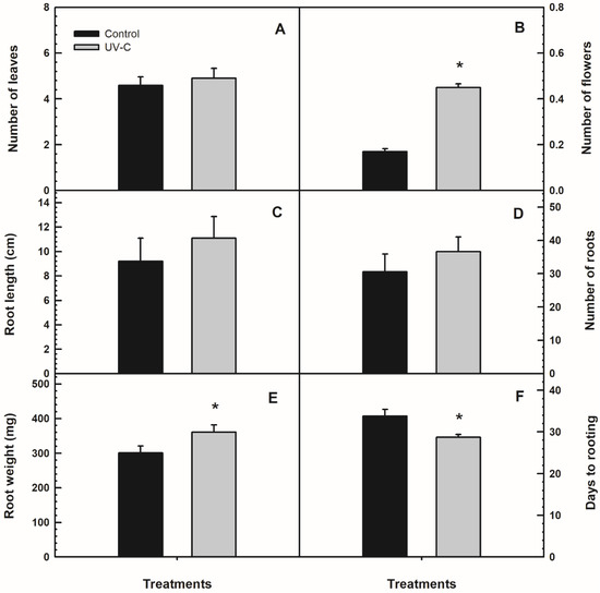 In general, UV-C irradiation positively affected the rooting of the cuttings. Although, the root length and the number of roots did not statistically differ between the treated and the untreated controls (Figure 6C,D), the root weight was significantly increased (Figure 6E,F) and days to rooting were decreased from 33.8 to 28.7 d (Figure 6E). The root weight of the UV-C-treated cuttings was 61 mg higher (Figure 6F).