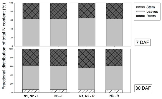 N was mainly distributed in the leaves at 7 and 30 DAF, although it was applied via the roots. This indicates that all N forms rapidly translocate from roots to leaves after fertilizer application.