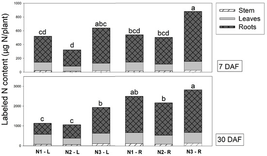 Total N content (µg15N/plant) in different organs of Vanda supplied with different labeled N sources (N1 = 2.5 mM 15NO3− + 2.5 mM NH4+, N2 = 2.5 mM NO3− + 2.5 mM 15NH4+, and N3 = 2.5 mM glutamine) via leaves (L) and roots (R) at 7 and 30 days after feeding (DAF). The different letters denote significant differences in treatments, analyzed by Tukey’s test.