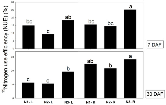 NUE in different organs of Vanda supplied with different labeled N sources (N1 = 2.5 mM 15NO3− + 2.5 mM NH4+, N2 = 2.5 mM NO3− + 2.5 mM 15NH4+, and N3 = 2.5 mM glutamine) via leaves (L) and roots (R) at 7 and 30 days after feeding (DAF). The different letters denote significant differences in treatments, analyzed by Tukey’s test.