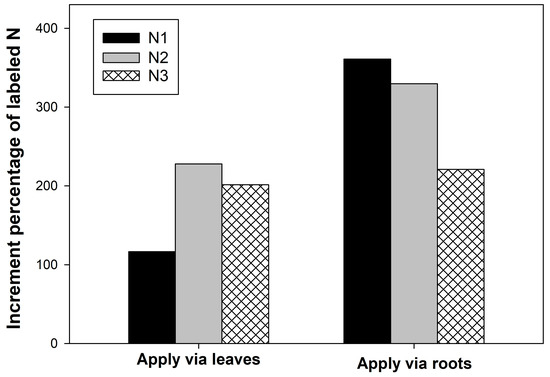 Increment percentage of labeled N in Vanda supplied with different N sources via leaves and roots. (N1 = 2.5 mM 15NO3− + 2.5 mM NH4+, N2 = 2.5 mM NO3− + 2.5 mM 15NH4+, and N3 = 2.5 mM glutamine).