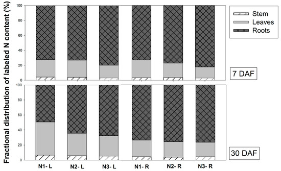 The N content in leaves, stems and roots, 7 and 30 DAF, is shown in Figure 1. A similar N distribution among organs was found between N1, N2 and N3. The distribution of total N content in plants at 7 DAF was highest in leaves (60%), followed by roots (35–40%) and stems (<1%), regardless of the N source and application site (Figure 1). At 30 DAF, the distribution of total N content in the stem gradually increased (about 7%) in all treatments (Figure 1). This suggests that, after feeding for 30 days, labeled N content was translocated into the stem in all N forms and application sites. Leaf N content was about 50–55%, and 40% was distributed in the roots. A similar result was reported by Panjama et al. (2018) [19], in which Vanda ‘Ratchaburi Fuchs-Katsura’ had an N content in the leaves of about 49%, in the roots of 47%, and little was found in the stem. Vanda comprises many pairs of thickened leaves, and the young leaves are considered sink organs. The old leaves and roots of Vanda act as storage organs [5].
