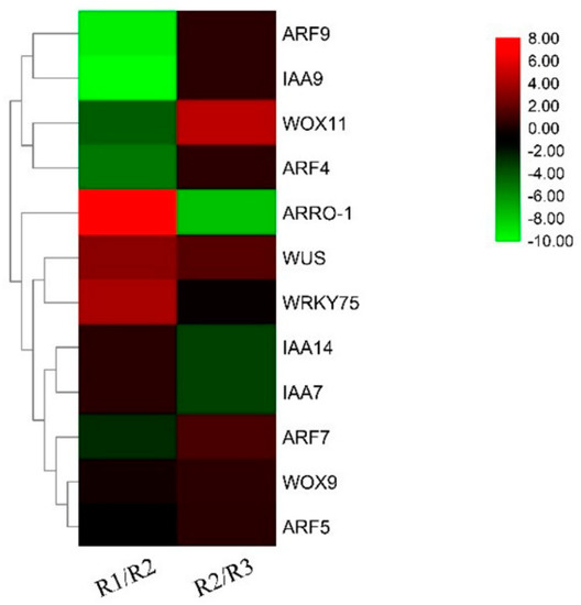 In a preliminary experiment, we used the root systems of live seedlings of Paeonia suffruticosa variety ‘Fengdanbai’ at the R1 (root primordium ungerminated period), R2 (root primordium induction period), and R3 (lateral root formation period) as materials to establish the transcriptome database of root development of Paeonia suffruticosa under sandy loam cultivation [42]. In this database, we identified a PsARRO−1 gene (GenBank accession number KJ620008), which was differentially expressed at both the R1/R2 and R2/R3 stages, compared to the expression of root−associated genes such as ARFs, IAAs, WRKYs, WUS, and WOXs in this database, as shown in Figure 1. It is specifically highly expressed in the root primordium germination stage, and it may be one of the important regulators of root primordium germination in Paeonia suffruticosa.