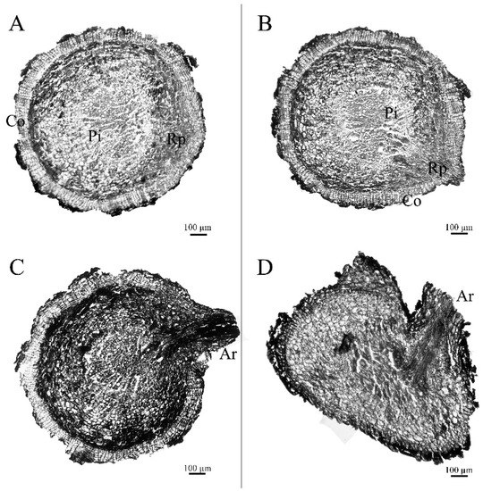 Morphological anatomic observation of Paeonia suffruticosa adventitious roots: (A). root primordium ungerminated period; (B). root primordium induction period; (C). root primordium convex; (D). root emergence; Co.—cortex; Rp.—adventitious root primordium; Pi.—pith; Ar.—adventitious root). The scale bar is 100 μm.