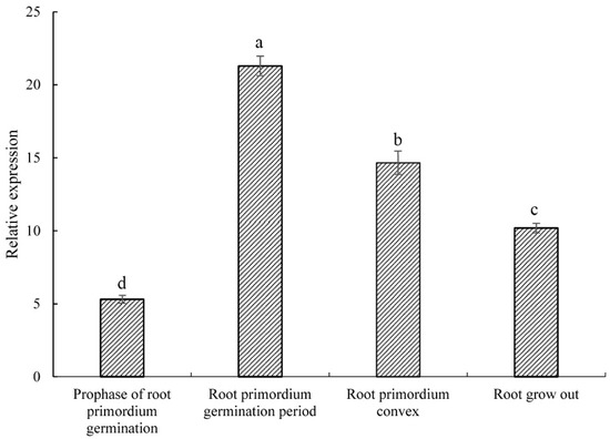 As shown in Figure 3, the relative expression of PsARRO−1 was low at the root primordium ungerminated period, reached a maximum value in the root primordium induction period, and then decreased at the convex root primordium formation and root emergence stages. The expression trend of this figure is the same as the description in Figure 1, showing the specific high expression of the PsARRO−1 gene in the root primordium induction period.