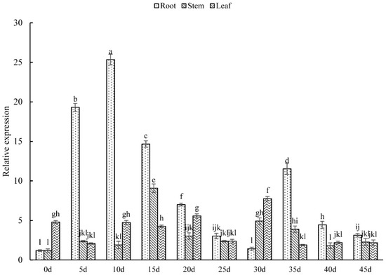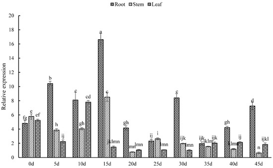 According to Figure 5, the expression level of PsARRO−1 gene was similar in the root, stem, and leaf tissues of Paeonia suffruticosa seedlings at 0 d, but differences became apparent as the seedlings grew. The expression level in the roots was significantly higher than in stems and leaves, and reached a maximum value at 15 d, which was about 2 times and 9 times that in the stems and leaves, respectively. The expression in stems and leaves was similar, and reached peak values at 15 d and 10 d, respectively.