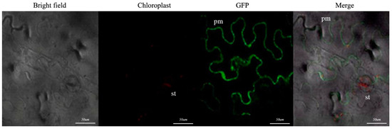 PsARRO−1 subcellular localization. The scale bar is 50 μm. (pm: plasma membrane; st: stomata).