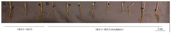 Transgenic Paeonia suffruticosa seedling roots of PsARRO−1. (A): TRV1 + TRV2; (B): TRV1 + TRV2−PsARRO−1. The scale bar is 5 cm.