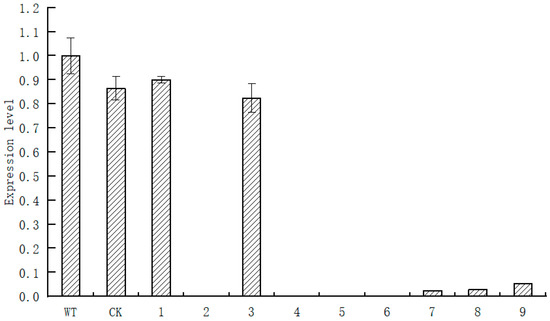 The root system of Paeonia suffruticosa was infected with agrobacterium, and the results are shown in Figure 7. The treated Paeonia suffruticosa roots were taken for RT−qPCR, and the results are shown in Figure 8. As can be seen from the figure, compared with wild−type plants and transformed no−load plants, the expression level of PsARRO−1 was significantly reduced, except for in plants 1 and 3. PsARRO−1 expression was significantly inhibited in Paeonia suffruticosa plants 2 and 4–9. The results showed that we successfully obtained the VIGS transient silent expression of PsARRO−1.