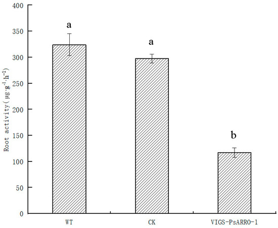 Root activity is one of the important indicators of plant root growth, and higher root activity shows stronger root germination and growth ability. In this study, the root activity of Paeonia suffruticosa was significantly reduced after transient silencing of the expression of PsARRO−1 in its root system, and PsARRO−1 may play a positive role in the root growth of Paeonia suffruticosa.