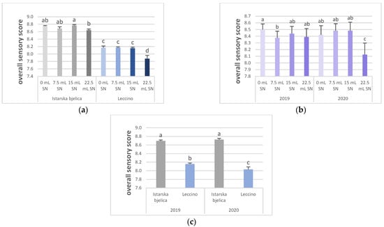 Multiple comparisons of the effects of (a) treatment (T) (0, 7.5, 15, and 22.5 mL of applied SN foliar fertilizer per 1 L of water) and cultivar (Cv.) (Istarska bjelica, Leccino), (b) treatment and year (Y) (2019, 2020), and (c) cultivar and year on the overall sensory score of olive oil. Different superscript lowercase letters represent statistically significant differences between the mean values at p < 0.05 that were obtained by a three-way ANOVA and Tukey’s test.