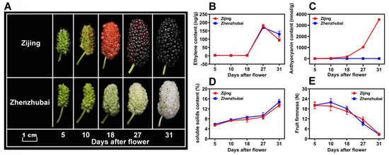 Fruit morphologies and physiological trends of Mulberry ‘Zi Jing’ (ZJ) and ‘Zhen Zhu Bai’ (ZZB) at different developmental stages. (A) Morphological profiles of the mulberry fruits from ZZB and ZJ. (B–E) Ethylene content, anthocyanin content, soluble solids content and fruit firmness, respectively, for ZJ and ZZB at different DAF. The white horizontal bar in panel A represents 1 cm in length. Each data point of the curves in panels (B–E) represents the mean of three independent replicates (±SE).