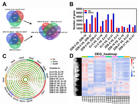 Identification and analysis of DEGs between ten comparison groups of ZZB-5 vs. ZZB-18, ZZB-5 vs. ZZB-27, ZZB-5 vs. ZZB-31, ZJ-5 vs. ZJ-18, ZJ-5 vs. ZJ-27, ZJ-5 vs. ZJ-31, ZZB-5 vs. ZJ-5, ZZB-18 vs. ZJ-18, ZZB-27 vs. ZJ-27 and ZZB-31 vs. ZJ-31 of ZJ and ZZB at different DAF stages, respectively. (A) Venn diagram representing the overlapped genes and unique genes. (B) The gene numbers were up- and down-regulated. (C) Genome-wide distribution of DEGs on a chromosomal scale. (D) Heatmap of DEGs from ZZB and ZJ at 5, 18, 27 and 31 DAF, respectively.