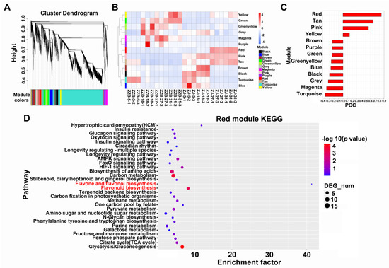 WGCNA analysis of transcripts in ZJ and ZZB genotypes during fruit development. (A) Hierarchical clustering tree. (B) Module eigengene expression. (C) Pearson correlation coefficient, PCC (r) between the red module and anthocyanin content in ZJ and ZZB at different post-flowering stages. (D) KEGG enrichment analysis of the red module.