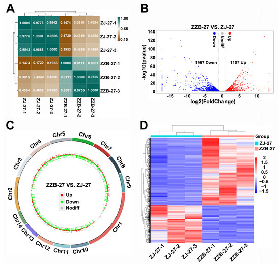 Identification and enrichment analysis of DEGs between ZZB and ZJ at 27 DAF. (A) Heatmap of samples from ZZB and ZJ with Pearson correlation efficiency at 27 DAF. (B) Volcano plot showing that DEGs between ZZB and ZJ at 27 DAF were categorized as up-regulated (red dots), down-regulated (blue dots) or not differentially expressed (gray dots). (C) Genome-wide distribution of DEGs on a chromosomal scale. (D) Heatmap of DEGs from ZZB and ZJ at 27 DAF.